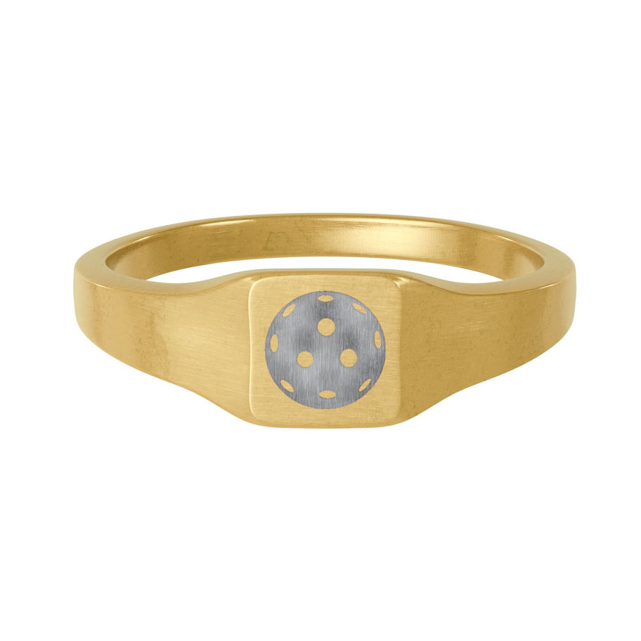 This square signet ring features an etched pickleball set into a low profile face. Minimal in design and balanced in weight, it delivers a refined presence built for daily wear. Crafted from surgical grade stainless steel and finished with 18K gold PVD, it maintains its structure and shine through constant use. The engraved detail stays sharp, creating a subtle, recognizable symbol without excess.
