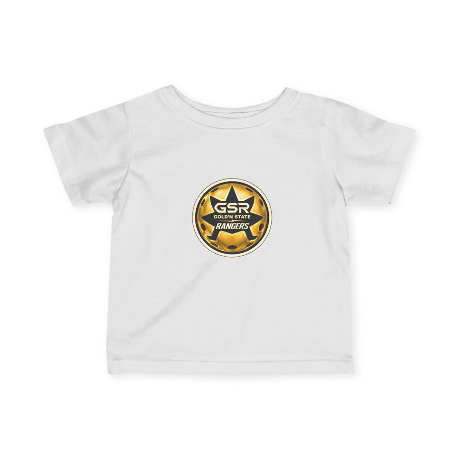 This lightweight infant tee delivers soft comfort with a clean, structured fit. The Rangers crest sits centered at the chest in sharp gold and black contrast, balanced by the curved GOLD'N STATE RANGERS across the back. Scaled with precision for a clear profile, the design remains bold without excess. Combed ring spun cotton provides a smooth feel against skin, while ribbed collar and reinforced shoulder tape maintain structure through wear and wash. Lightweight. Durable. Built for comfort.